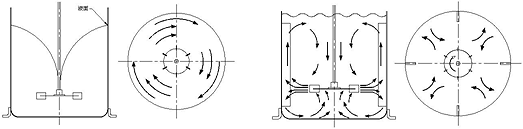 A. 中心插浸在低黏度且無擋板阻流之操作時(shí),液體會(huì)產(chǎn)生打旋現(xiàn)象(圖D),攪拌速度越快則打旋越強(qiáng)烈,此種混合效率最低,通常系加裝擋板加以消除(圖E),在直立槽內(nèi)加裝四個(gè)直立標(biāo)準(zhǔn)擋板組,板寬約槽直徑之1/10~1/12左右,由於進(jìn)一步增加板寬時(shí)并未發(fā)現(xiàn)動(dòng)力增加,故由輪葉動(dòng)力消耗觀點(diǎn)看,此項(xiàng)寬度并不能視為標(biāo)準(zhǔn)之板寬,因?yàn)閷?shí)驗(yàn)證明發(fā)現(xiàn),板寬范圍有助於流體上下打混,并消除渦流現(xiàn)象。但是板數(shù)增加時(shí),動(dòng)力消耗增加。當(dāng)液體黏度增加時(shí),對擋板需求層度隨之降低,板寬隨之減小,擋板可與槽壁保留適度之空隙讓流體穿過,而不至於產(chǎn)生滯留現(xiàn)象,更高黏度之液體則可采用斜角度方式安裝。